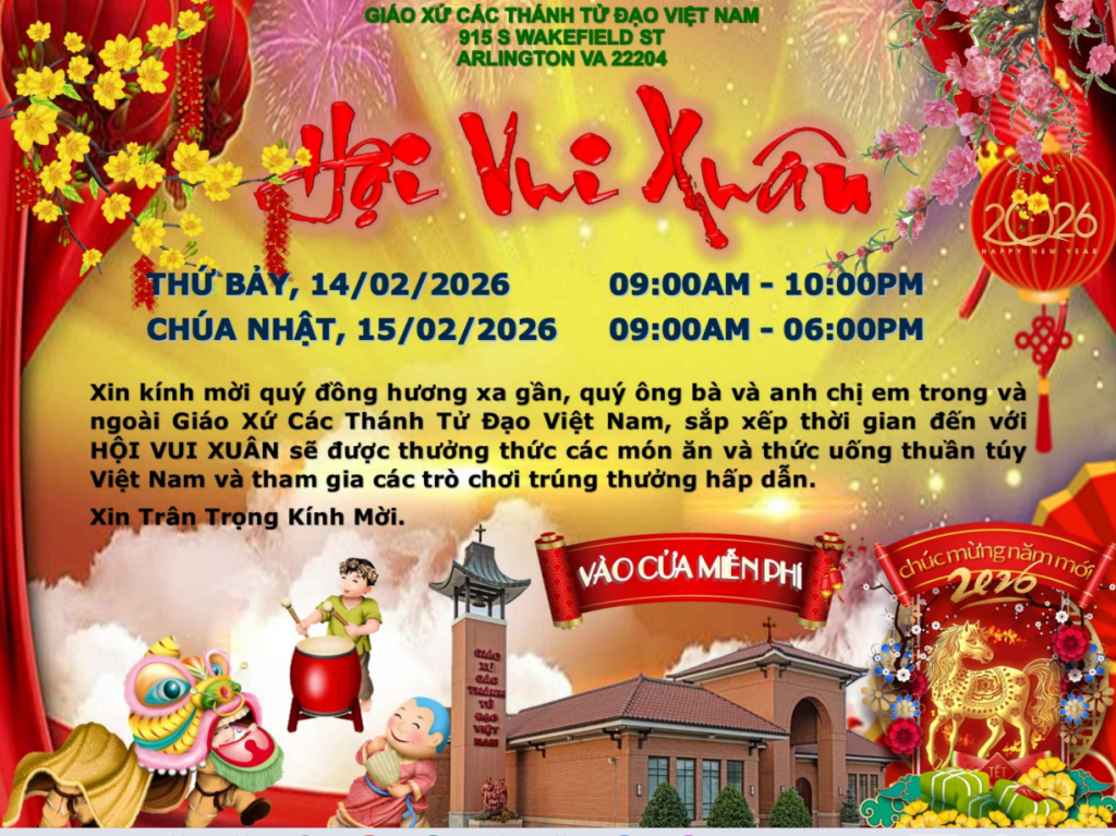 Theo nguồn tin trên trang mạng của Giáo Xứ Các Thánh Tử Đạo Việt Nam tại Arlington trong tiểu bang Virginia HỘI VUI XUÂN MỪNG TẾT NGUYÊN ĐÁN BÍNH NGỌ – 2026 Trong tinh thần hiệp nhất và yêu thương, Giáo xứ Các Thánh Tử Đạo Việt Nam – Arlington, Virginia, sẽ tổ chức HỘI VUI XUÂN BÍNH NGỌ, tại Hội Trường Trần Duy Nhất. Xin kính mời quý đồng hương xa gần, quý ông bà và anh chị em trong và ngoài Giáo Xứ Các Thánh Tử Đạo Việt Nam, sắp xếp thời gian đến với HỘI VUI XUÂN sẽ được thưởng thức các món ăn và thức uống thuần túy Việt Nam và tham gia các trò chơi trúng thưởng hấp dẫn. Thời gian: Thứ Bảy, ngày 14 tháng 2, từ 9 giờ sáng đến 10 giờ tối. Chúa Nhật, ngày 15 tháng 2, từ 9 giờ sáng đến 6 giờ chiều. Vào cửa miễn phí – Xin trân trọng kính mời! WHAT: 2025 Tet Festival WHEN: Friday, January 25, 2025 from 8 PM to 11 PM Saturday, January 25, 2025 from 10 AM to 10 PM Sunday, January 25, 2025 from 11 AM to 4 PM WHERE: Holy Martyrs of Vietnam Church Address: 915 S Wakefield St, Arlington, VA 22204 Phone: (703) 553-0370 http://www.cttdva.org/ Post navigation Cáo phó và Thánh Lễ Tiễn Biệt của Bùi Dương Liêm