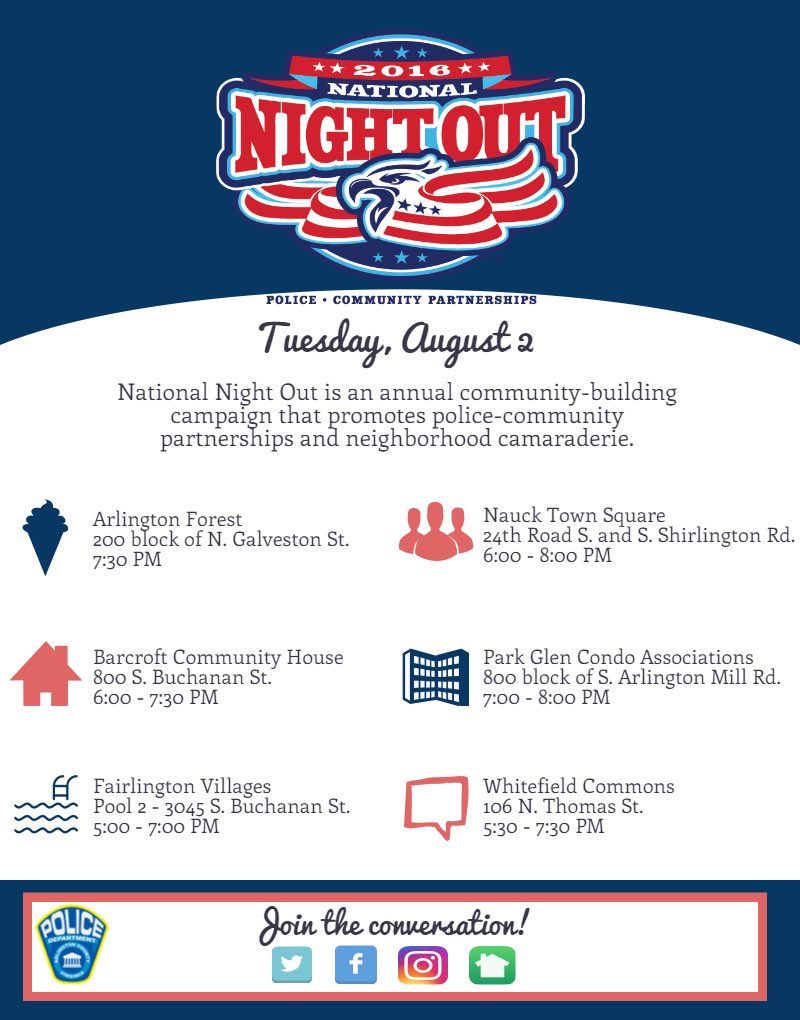 National Night Out is here! Make our community stronger by joining The Arlington County Police Department and your neighbors at events throughout Arlington County TONIGHT!