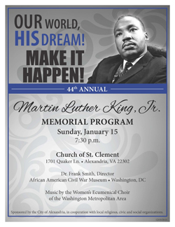 Theo nguồn tin trên trang mạng thành phố Alexandria Title: 44th Annual Martin Luther King Memorial Program Date & Time: Sun Jan 15, 2017 7:30 PM – 8:30 PM Location: Church of St. Clement Event Details: 2017 Community MLK Program Flyer 2017 Community MLK Program Flyer Annual memorial event celebrating Civil Rights contributions featuring Dr. Frank Smith, Keynote, and music by the Womens Ecumenical Choir of Washington Metropolitan Area https://apps.alexandriava.gov/Calendar/Detail.aspx?si=15243 Post navigation Thông Báo Đóng Cửa Các Văn Phòng Cơ Quan Trong Thành Phố Alexandria ở tiểu bang Virginia & Thời Khóa Biểu Các Dịch Vụ Khi Đóng Cửa Trong Ngày Lễ kỷ niệm sinh nhật của Martin Luther King năm 2017 Thông Báo Đóng Cửa Các Văn Phòng Cơ Quan Trong Thành Phố Alexandria ở tiểu bang Virginia & Thời Khóa Biểu Các Dịch Vụ Khi Đóng Cửa Trong Ngày Lee Jackson, Lễ kỷ niệm sinh nhật của Martin Luther King, Lễ nhậm chức của tổng thống Mỹ năm 2017